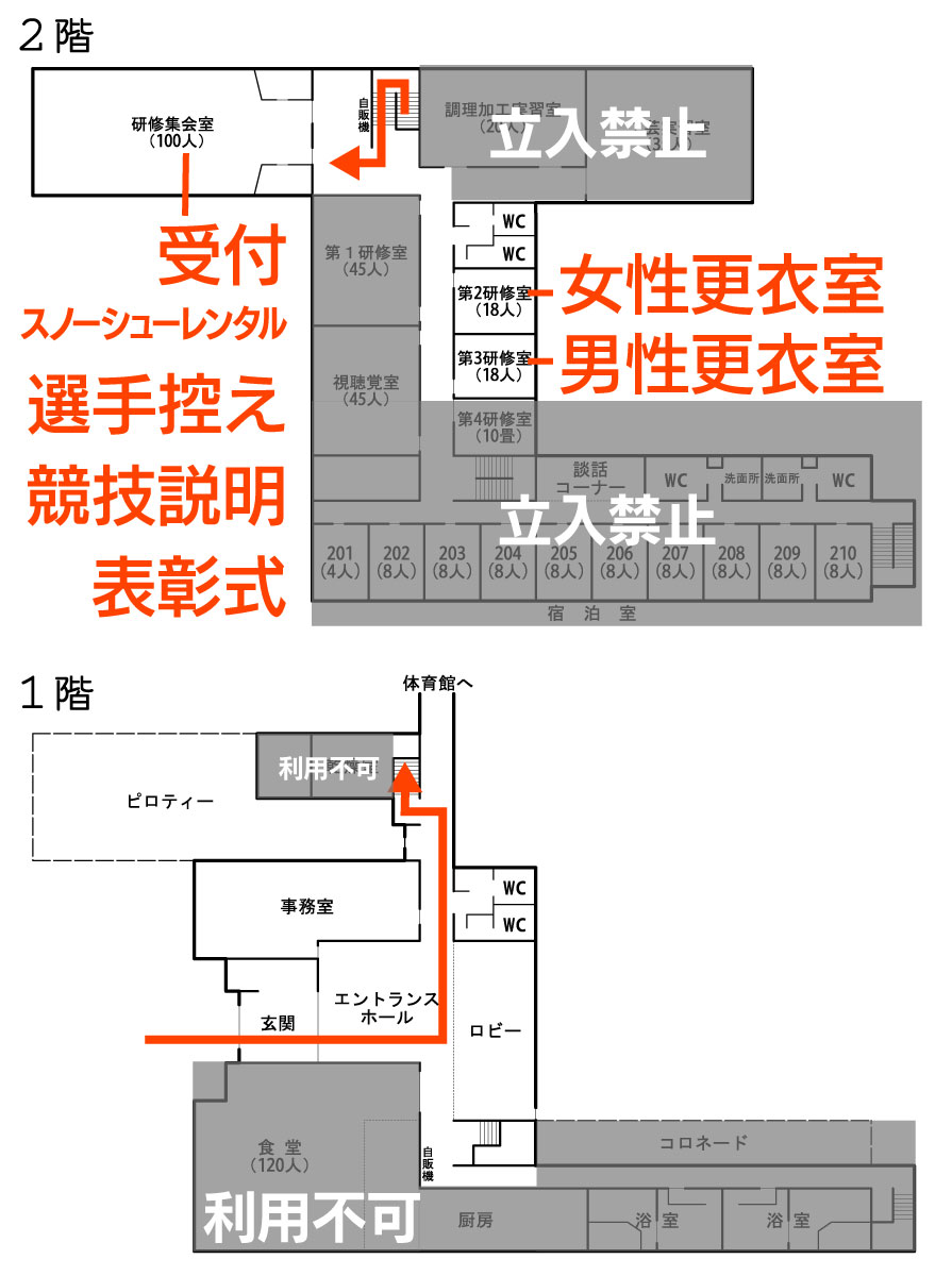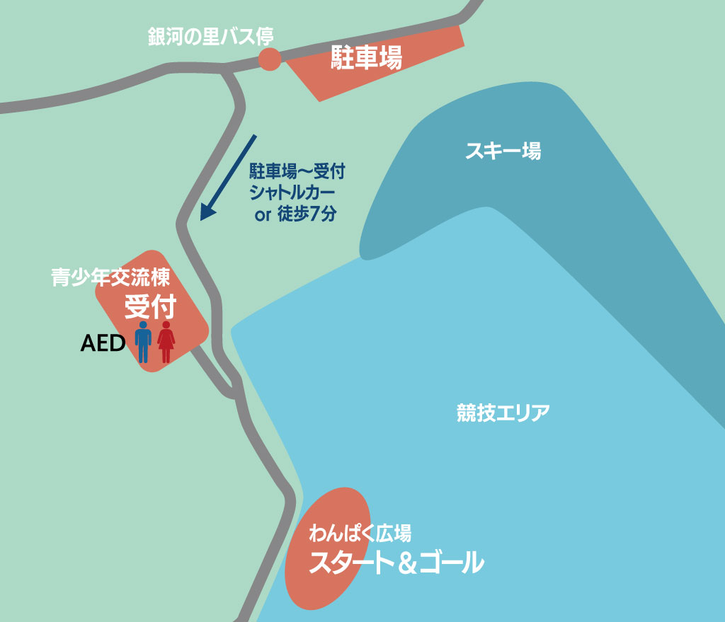 • レース終了後の運行はありません。徒歩にてお戻りください。下り坂約700m、徒歩7分。歩道がなく雪で道路幅が狭くなっておりますので十分ご注意ください。