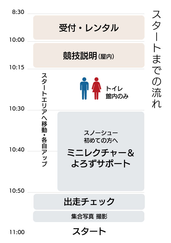 • レース用スノーシューに余裕があるので、汎用→レース用への変更が可能です(先着、差額1500円を当日お支払い)。サイトのお問い合わせフォームからご連絡ください。